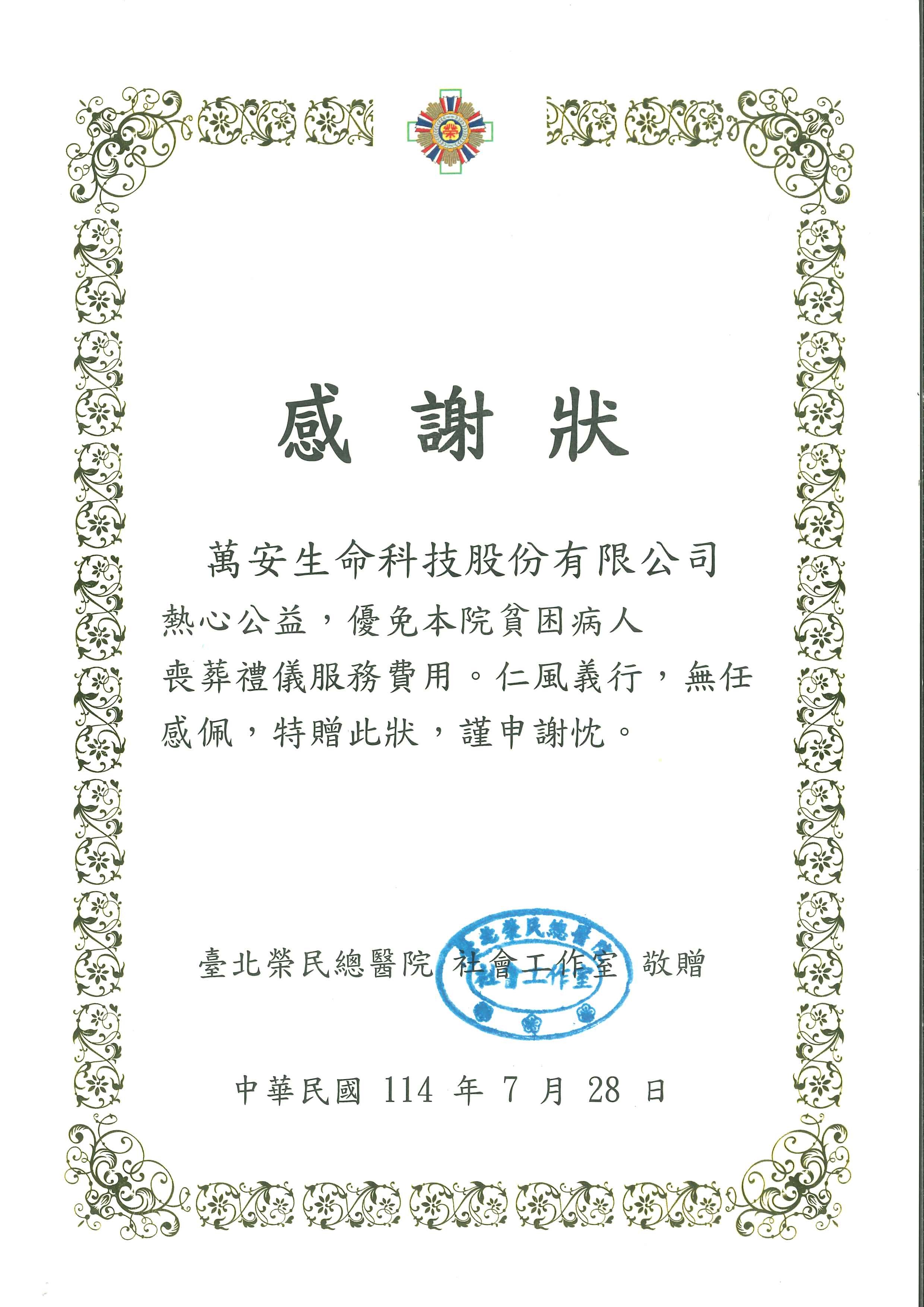 萬安生命科技股份有限公司熱心公益,優免本院貧困病人喪葬禮儀服務費用。仁風義行,無任感佩,特贈此狀,謹申謝忱。