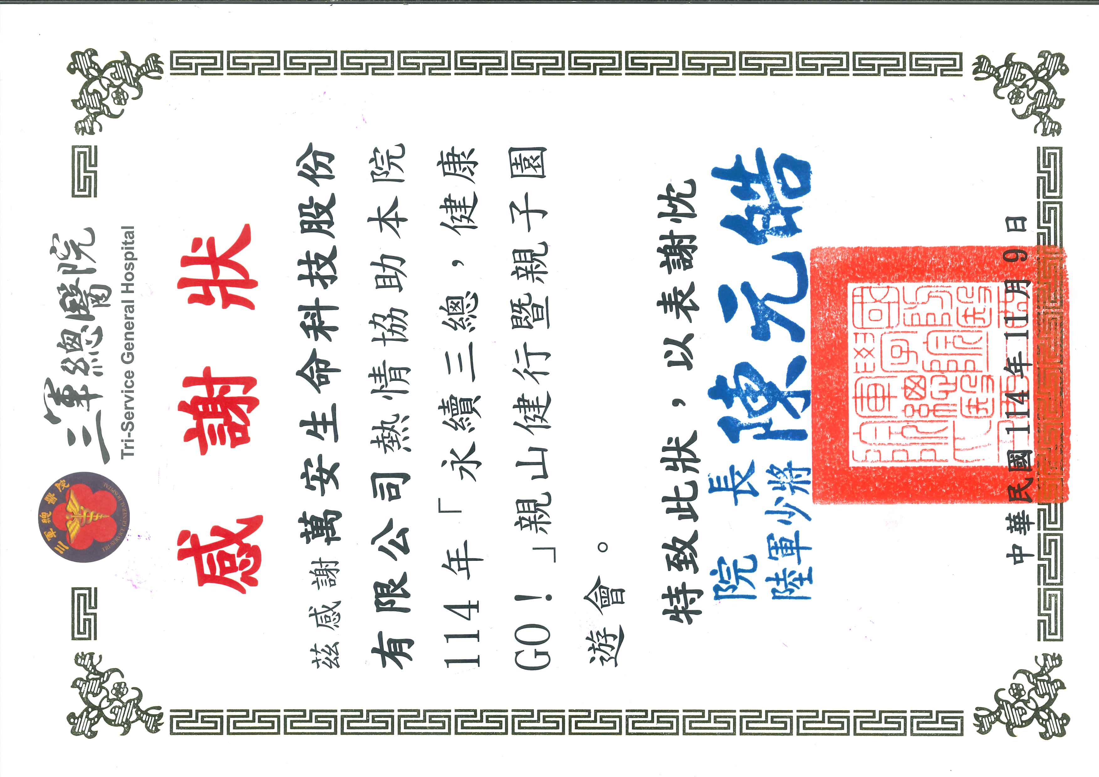 茲感謝萬安生命科技股份有限公司熱情協助本院114年「永續三總,健康GO!」親山健行暨親子園遊會。特致此狀,以表謝忱。