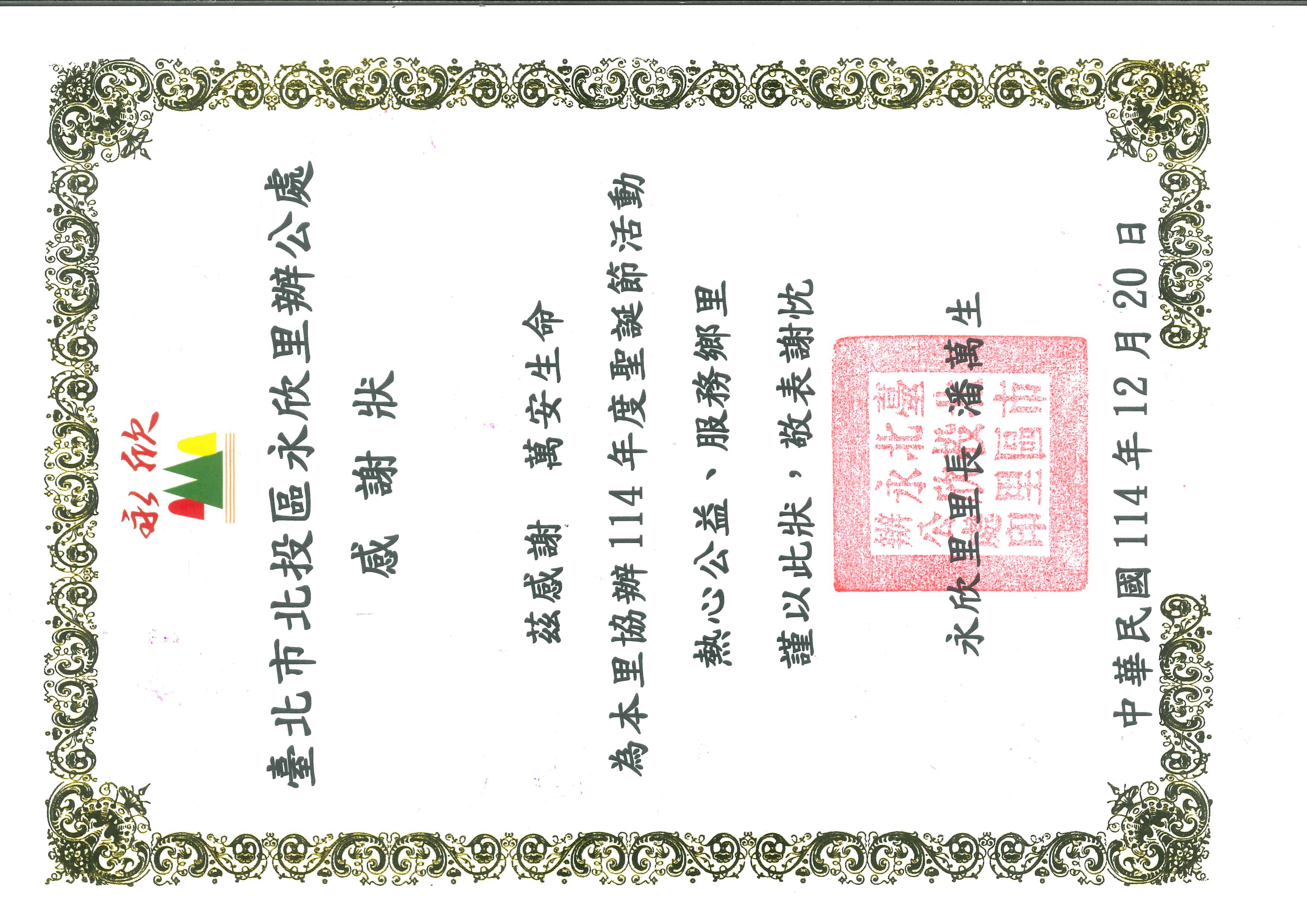 茲感謝萬安生命為本里協辦114年度聖誕節活動,熱心公益,服務鄉里,謹以此狀,敬表謝忱。