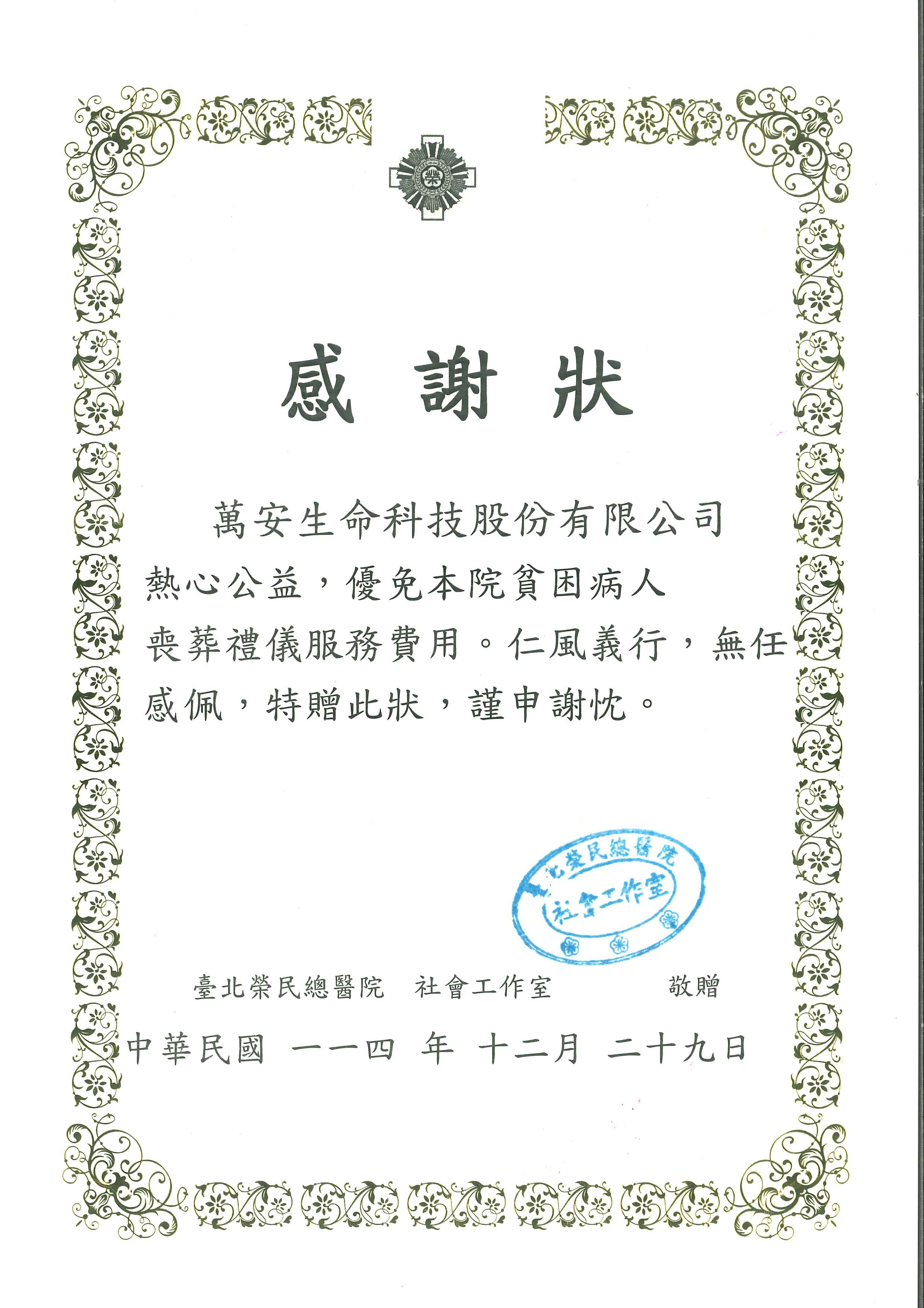 萬安生命科技股份有限公司熱心公益,優免本院貧困病人喪葬禮儀服務費用。仁風義行,無任感佩,特贈此狀,謹申謝忱。
