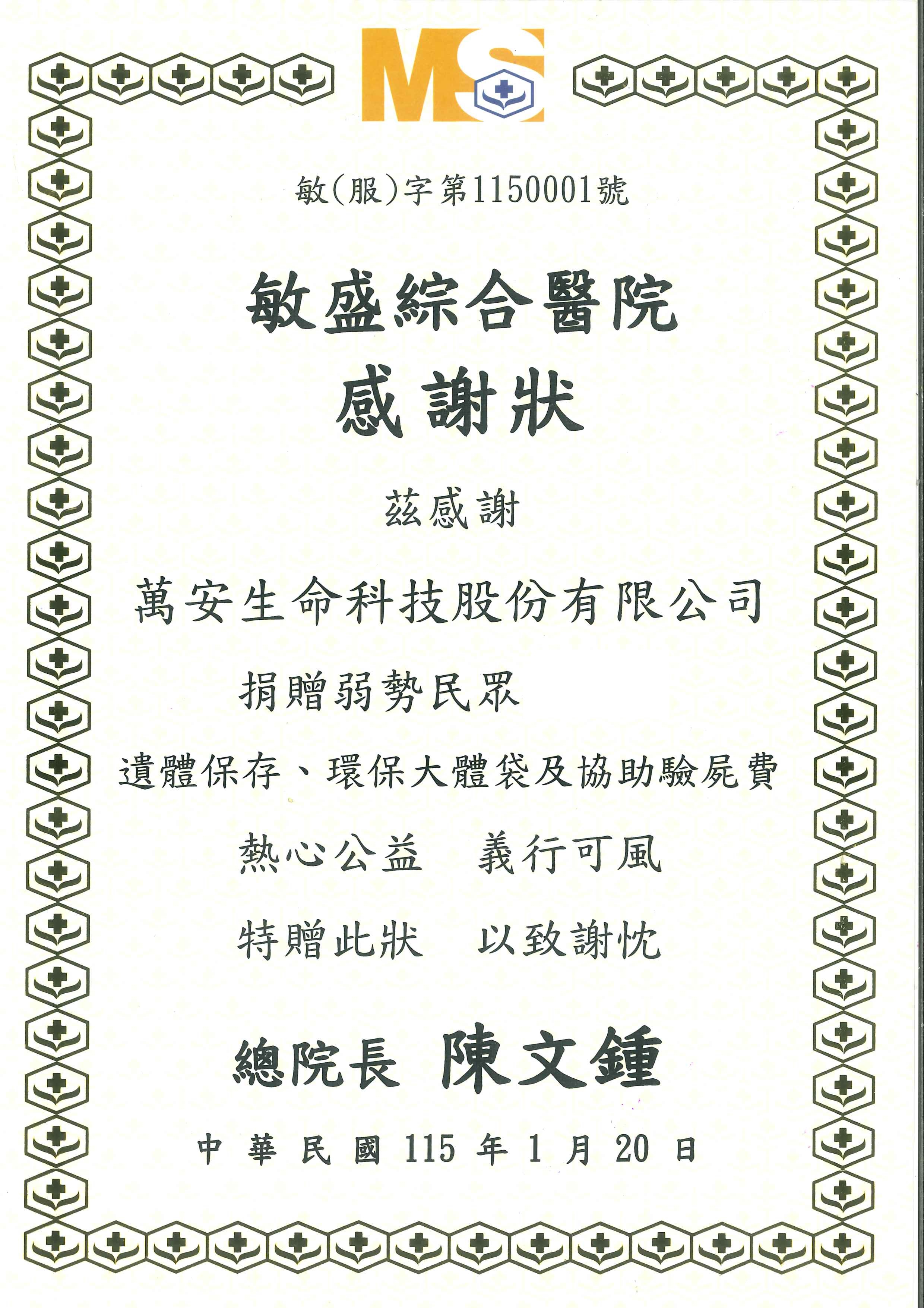 茲感謝萬安生命科技股份有限公司捐贈弱勢民眾遺體保存、環保大體袋及協助驗屍費,熱心公益,義行可風,特贈此狀,以致謝忱。