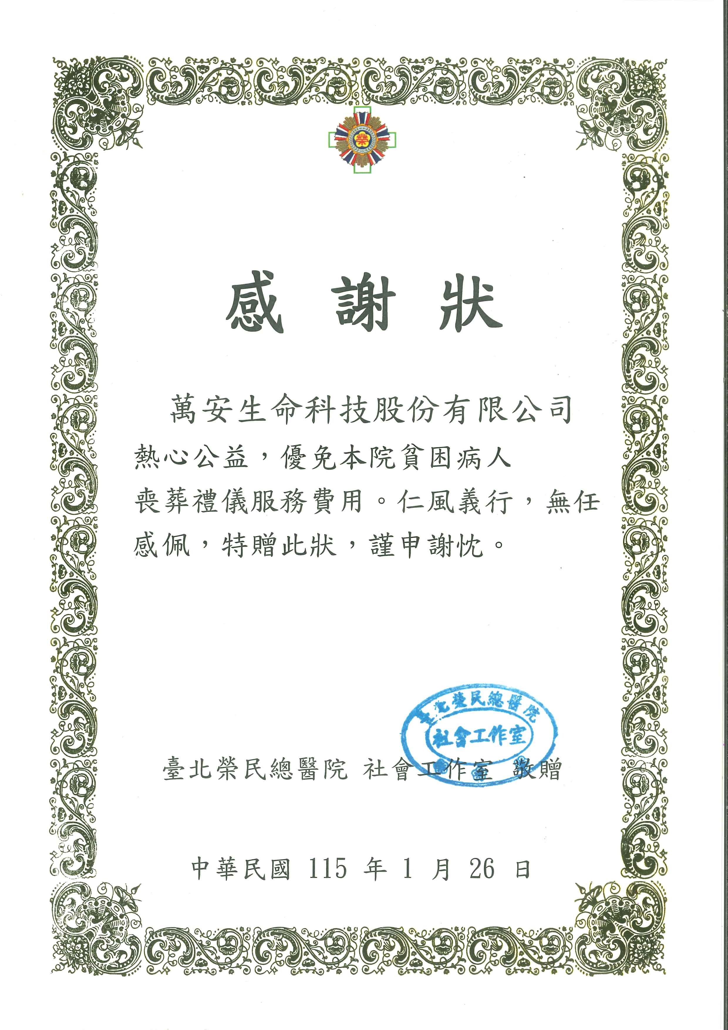 萬安生命科技股份有限公司熱心公益,優免本院貧困病人喪葬禮儀服務費用。仁風義行,無任感佩,特贈此狀,謹申謝忱。
